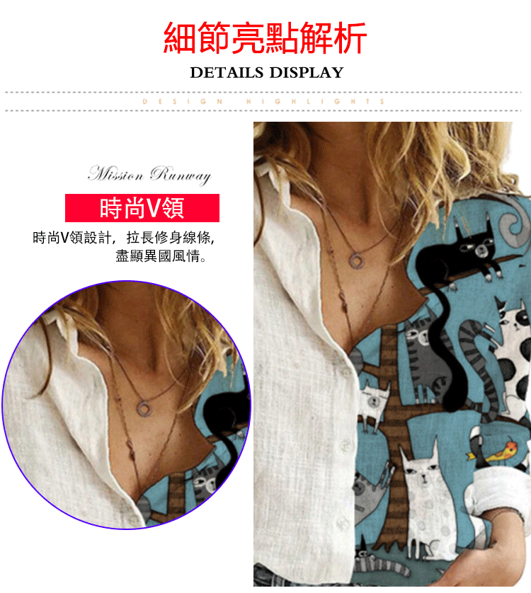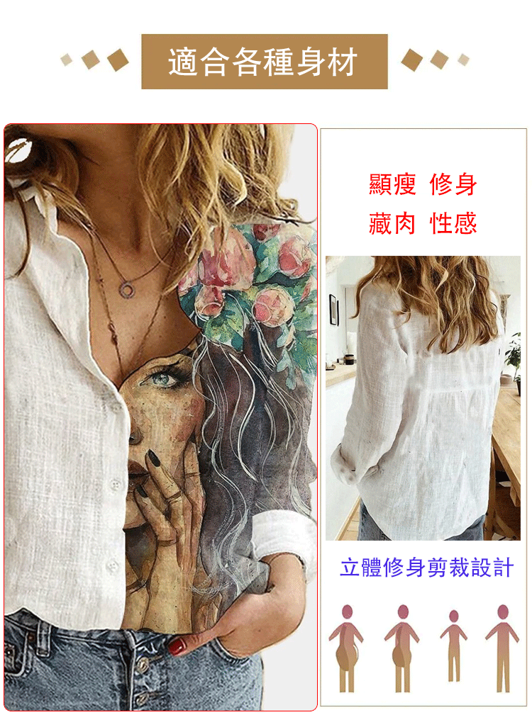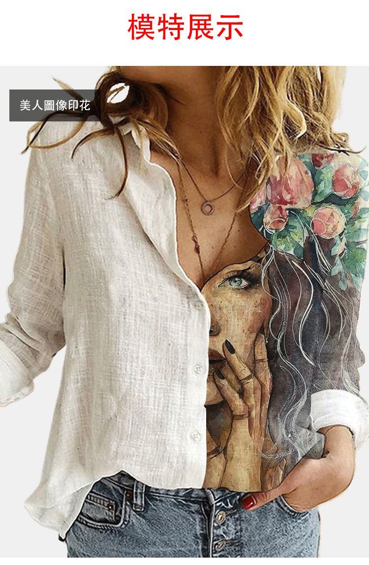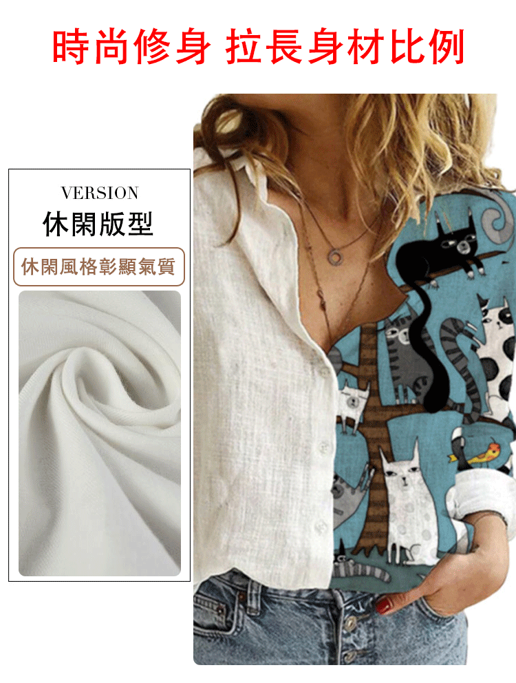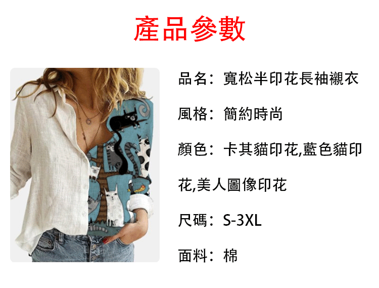 休閒寬松半印花長袖襯衣